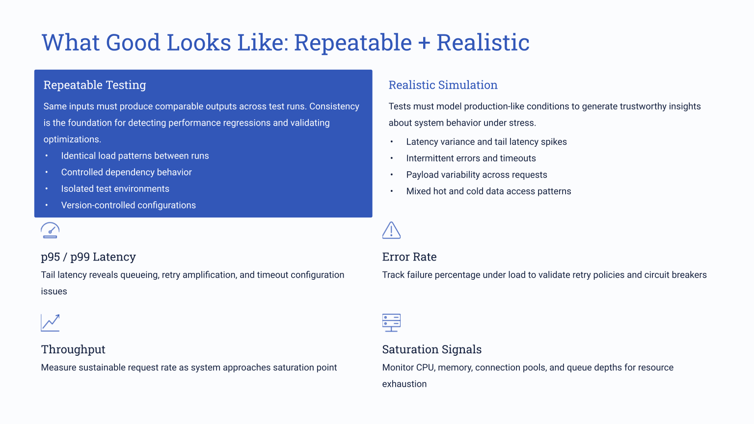 Replacing every external dependency with a simulated version you control allows you to introduce complexity one layer at a time. When your P99 degrades or your error rate climbs, you know what caused it because you controlled what changed. That precision is impossible when testing against live dependencies that shift between runs.
